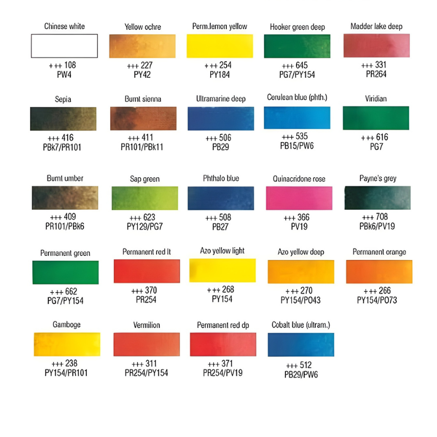 تتميز هذه المجموعة بتركيز عالٍ من الأصباغ يمنح الألوان قوة ووضوحاً عالياً مع شفافية ممتازة، مما يجعلها مثالية لتقنيات الرسم المائي وإنشاء التدرجات اللونية الناعمة.