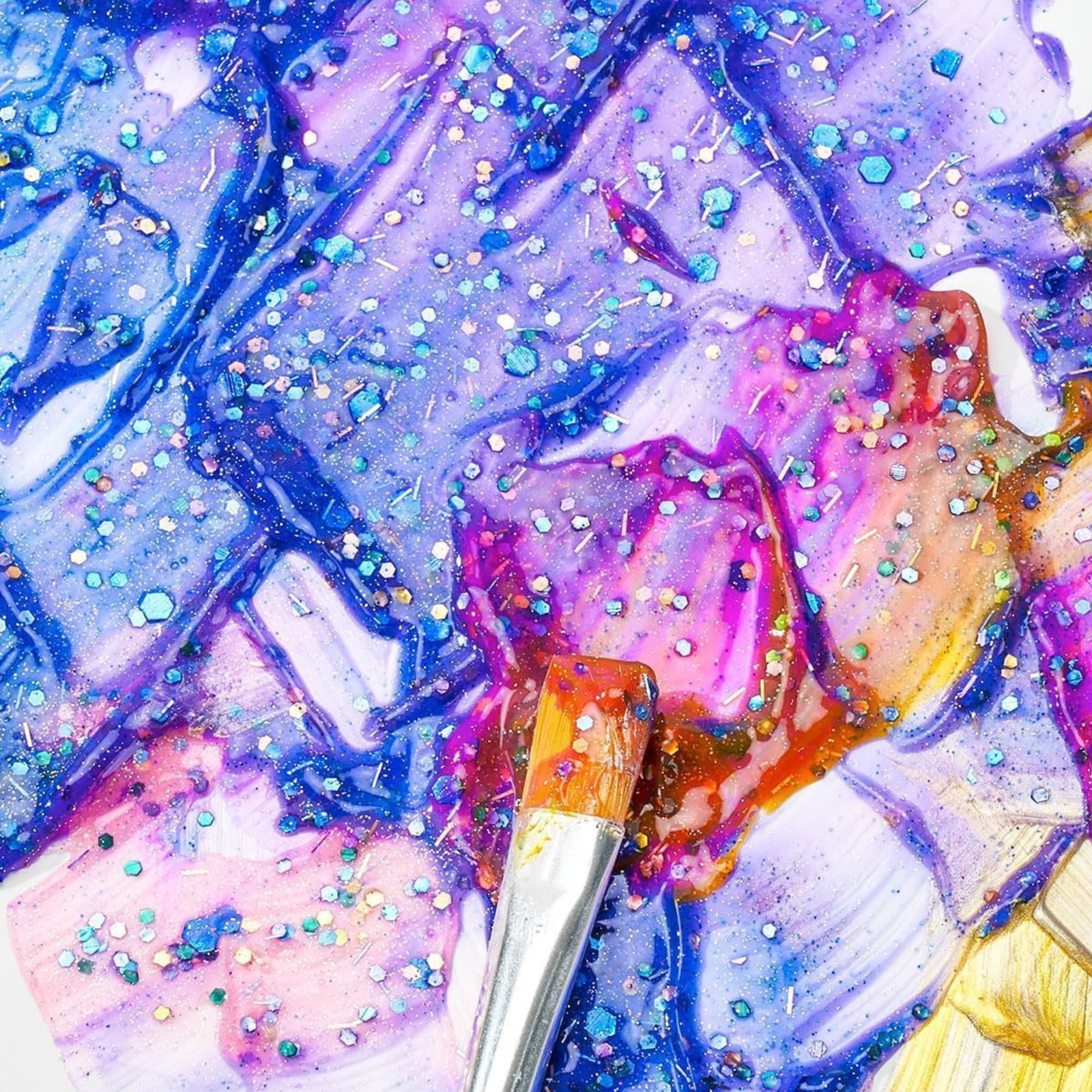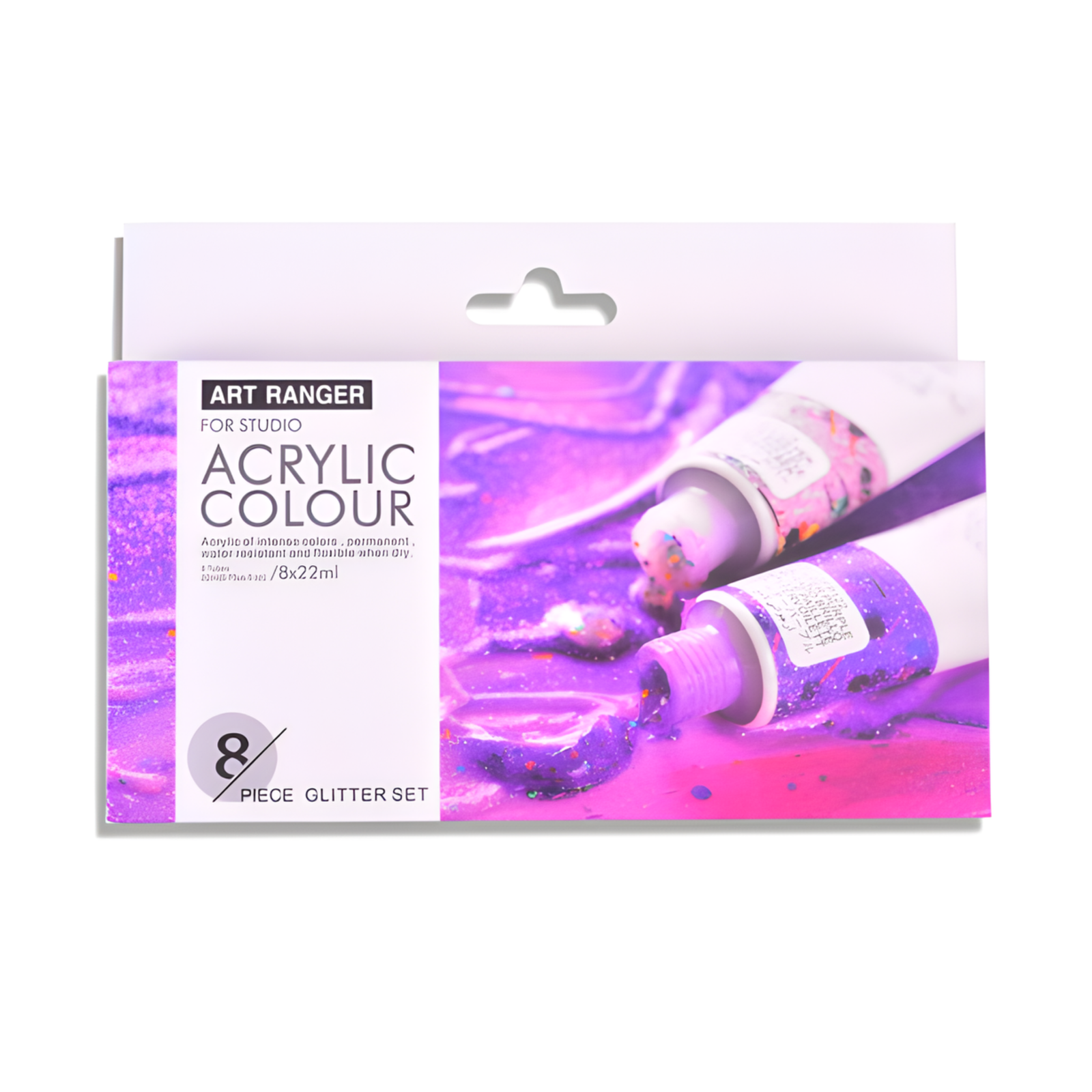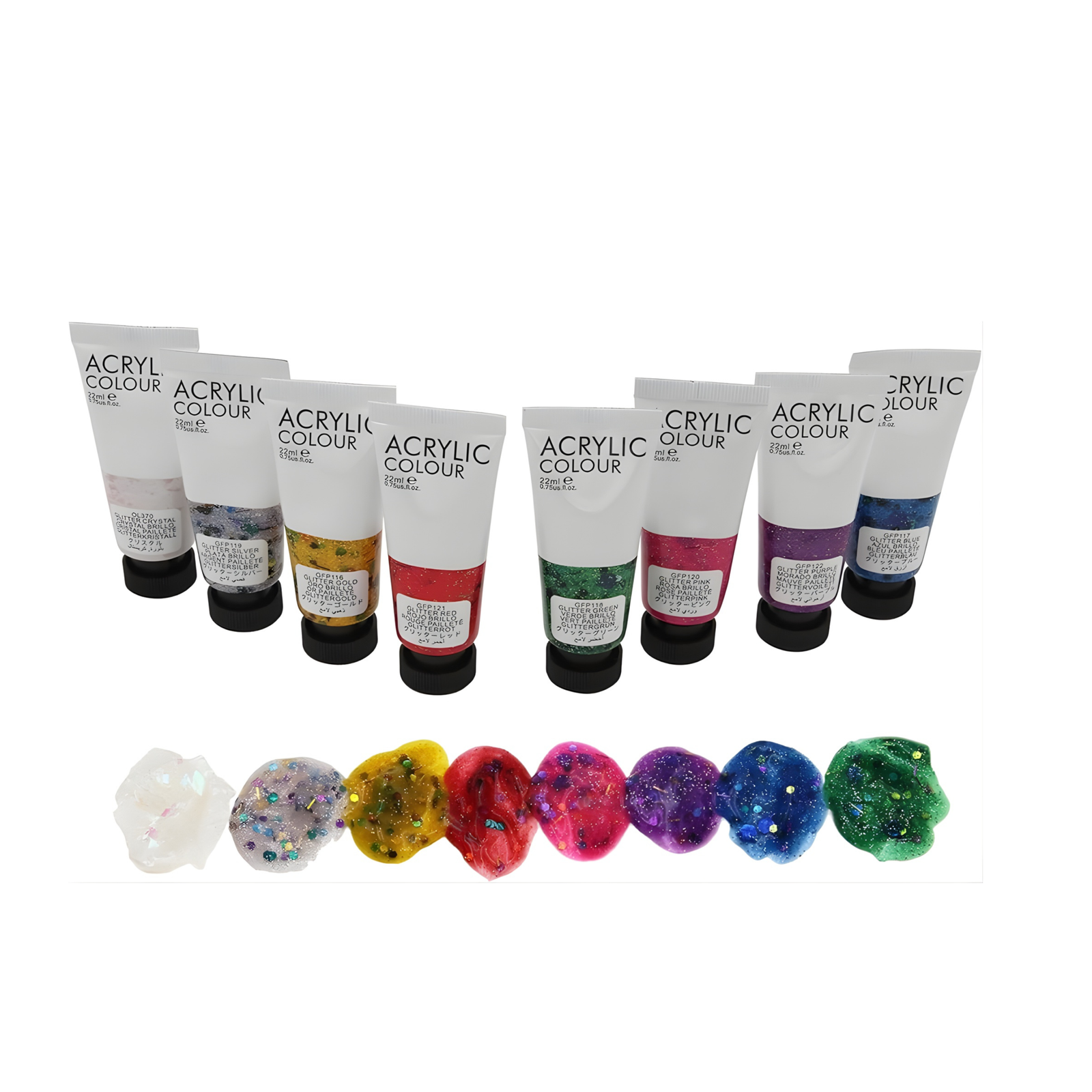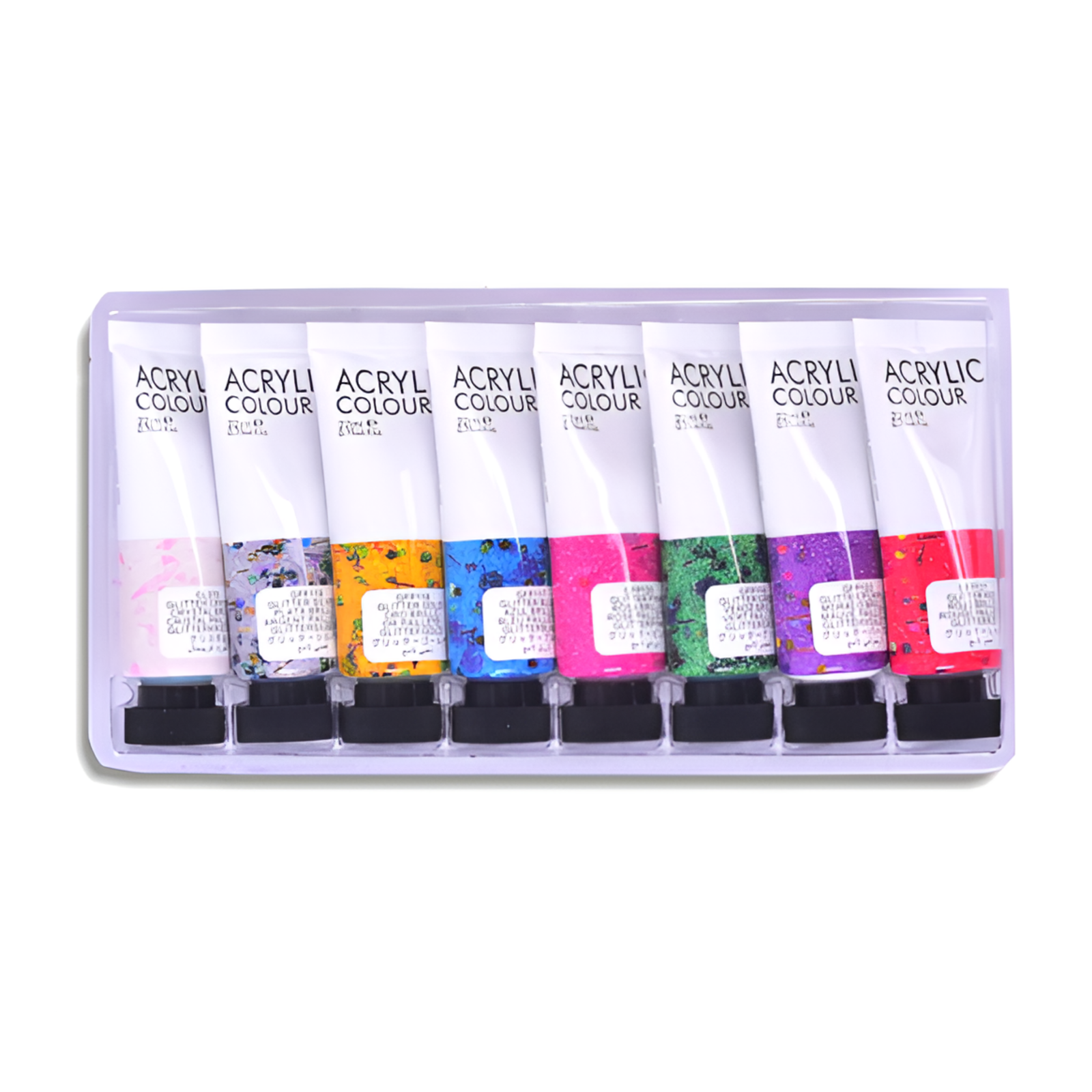 مجموعة ألوان أكريليك جليتر (Glitter) جاهزة للاستخدام تضم 8 ألوان لامعة تجمع بين قوة لون الأكريليك وتأثير البريق اللامع، مما يمنح الأعمال الفنية لمسة زخرفية مميزة.
