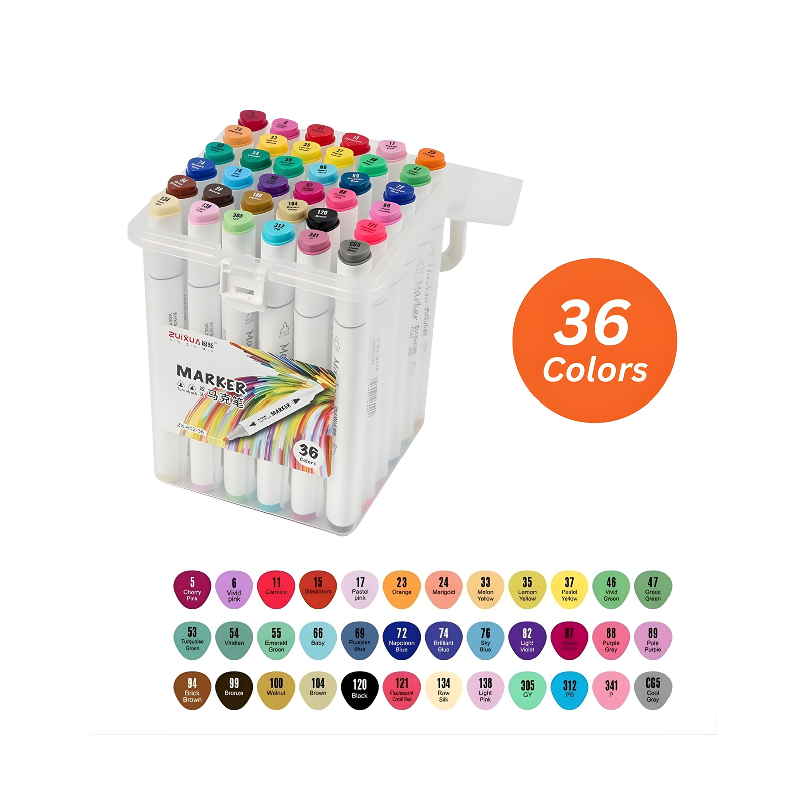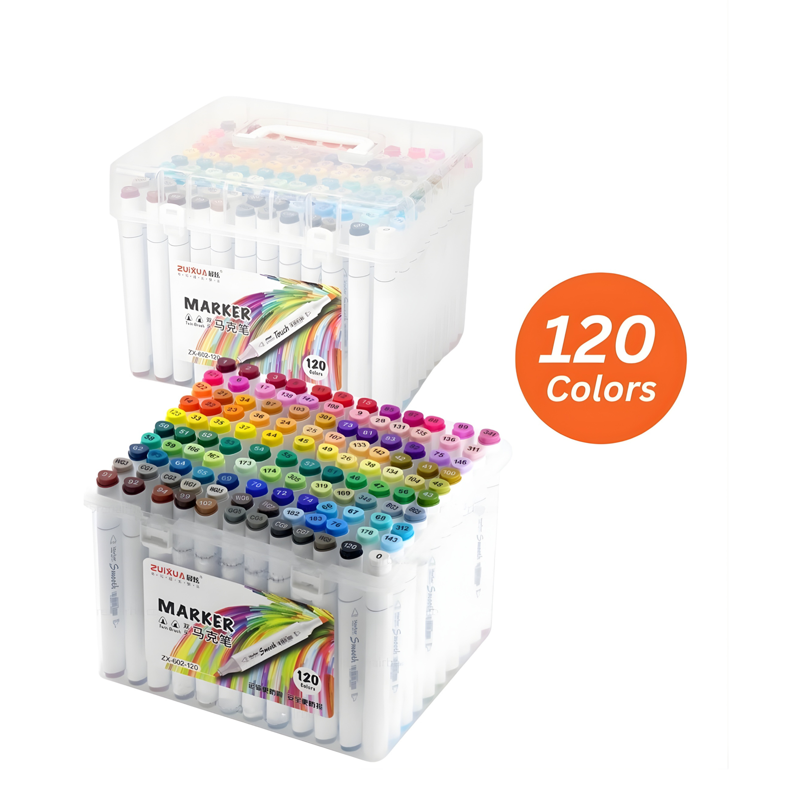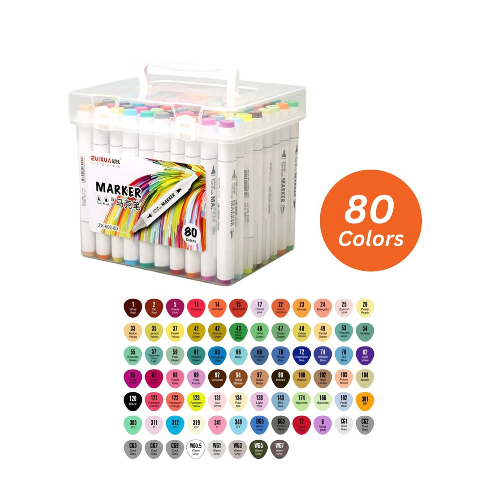 تأتي المجموعة داخل علبة بلاستيكية متينة وسهلة الحمل تساعد على تنظيم الماركرات وحمايتها، مما يجعلها مثالية للاستخدام اليومي أو في الاستوديو.
