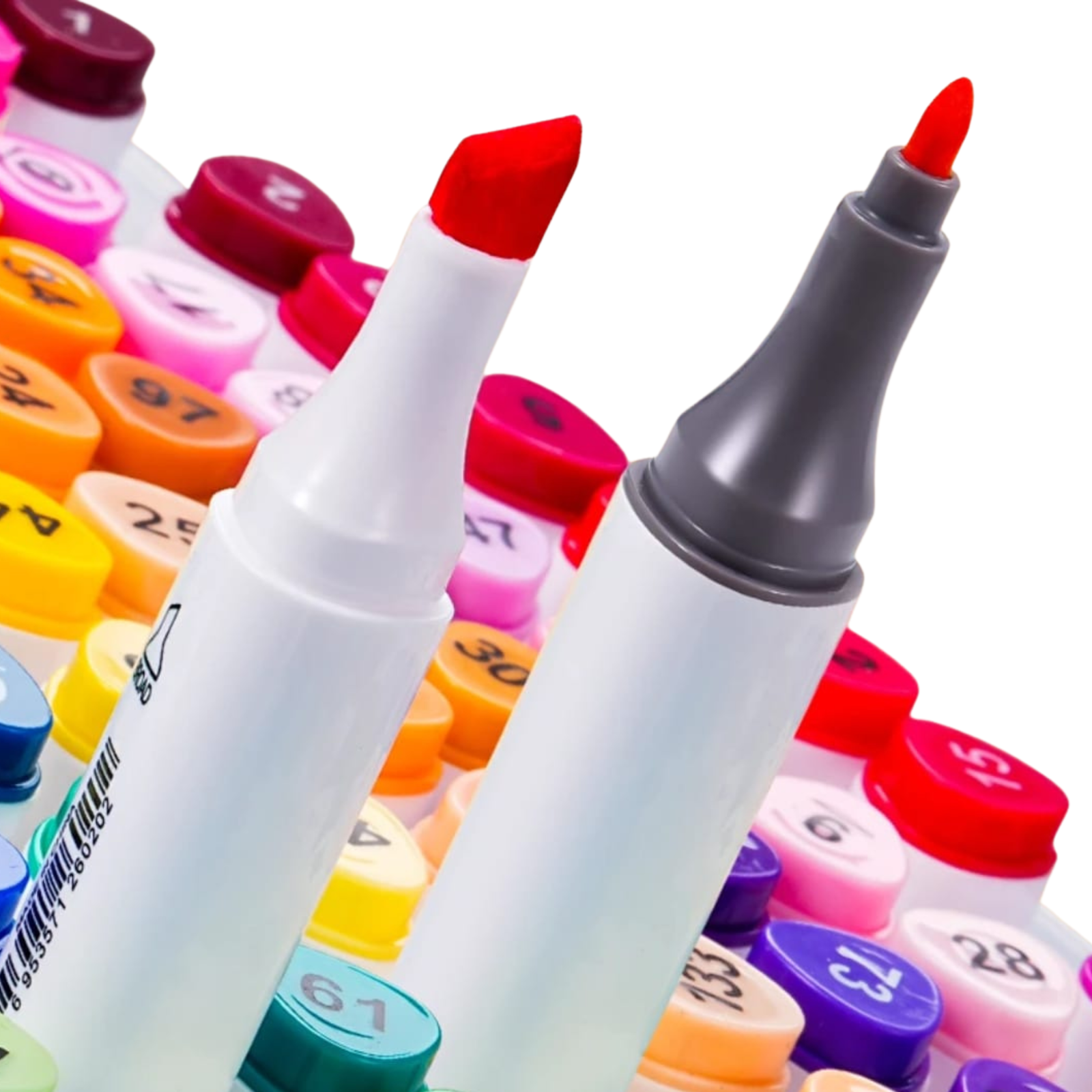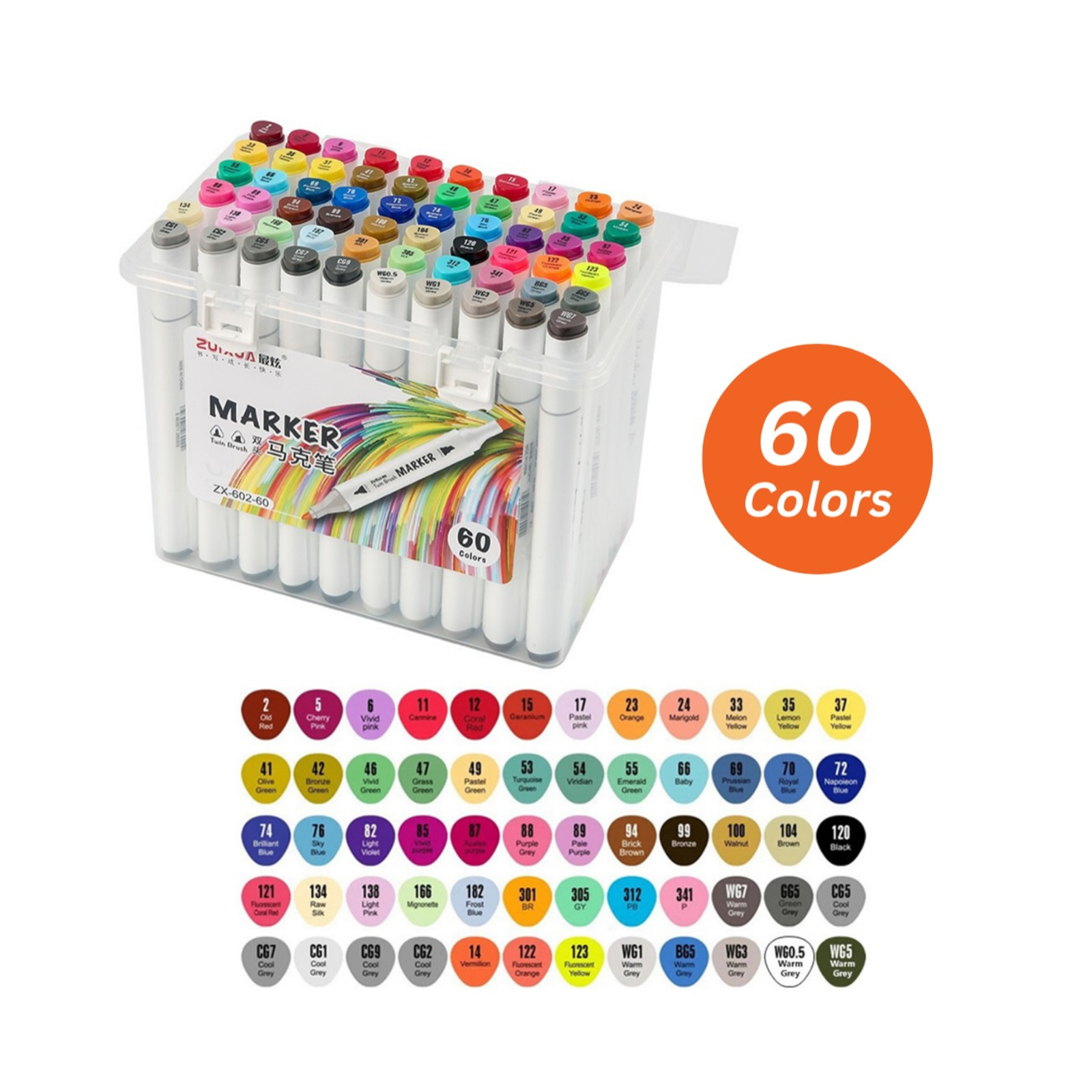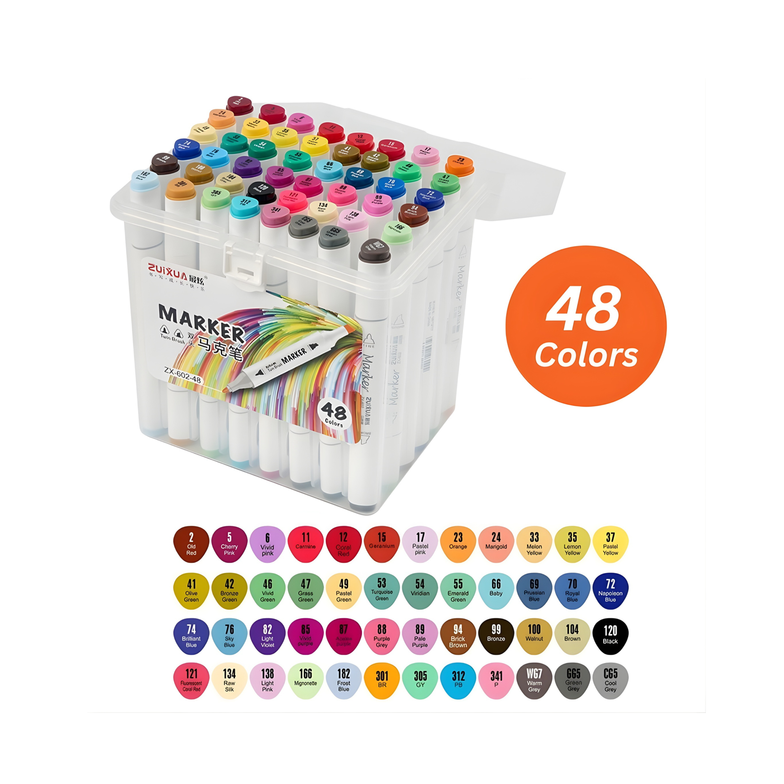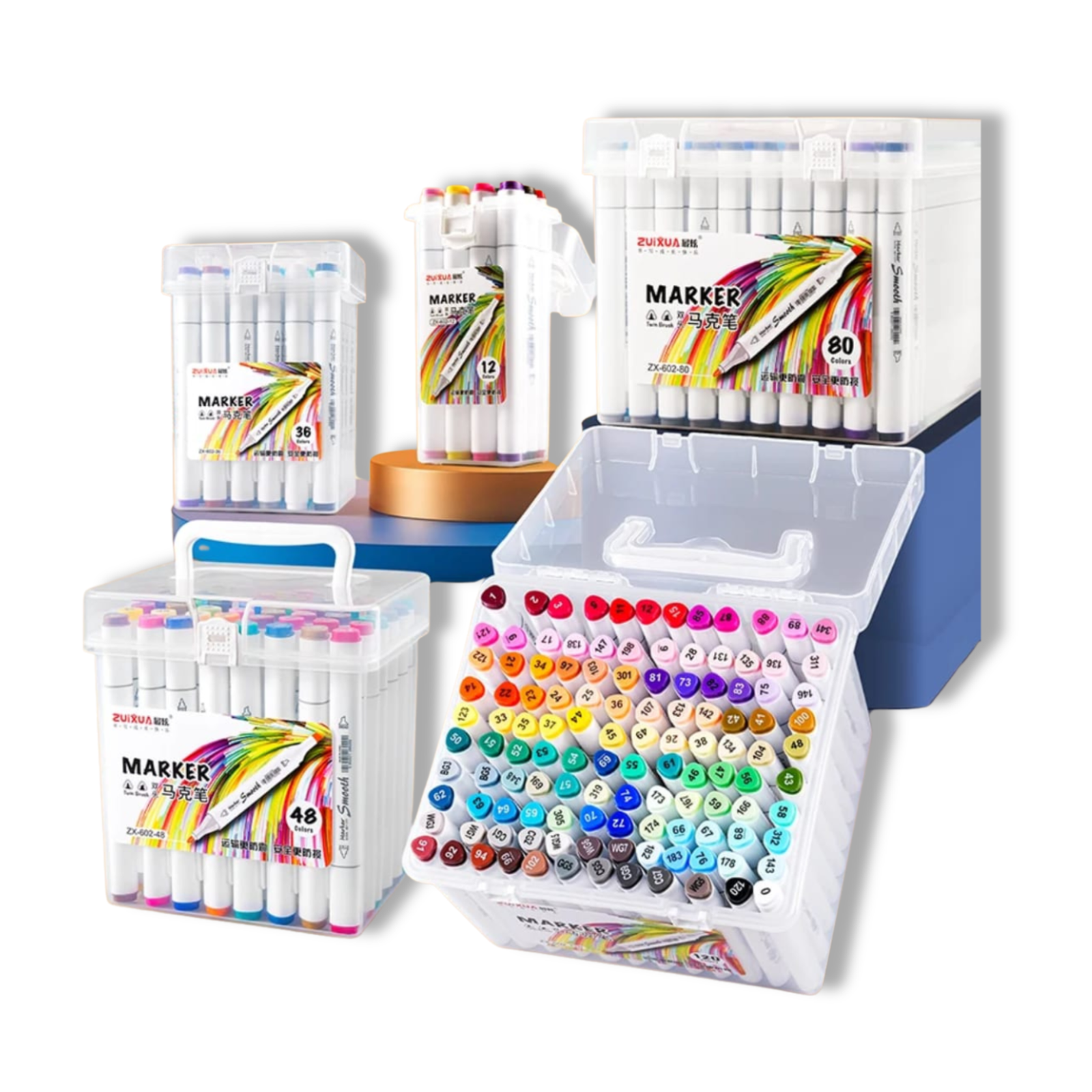 تأتي المجموعة داخل علبة بلاستيكية متينة وسهلة الحمل تساعد على تنظيم الماركرات وحمايتها، مما يجعلها مثالية للاستخدام اليومي أو في الاستوديو.