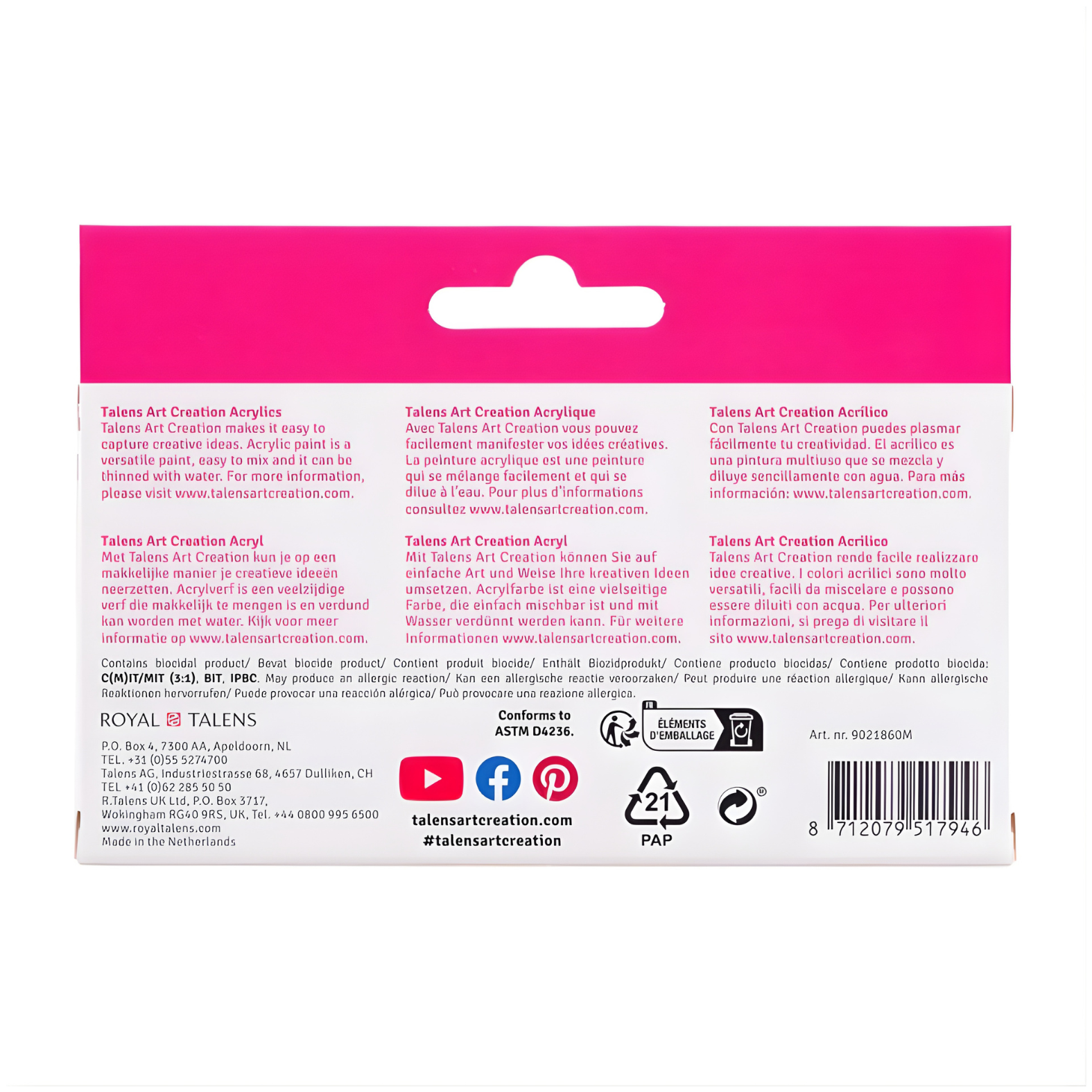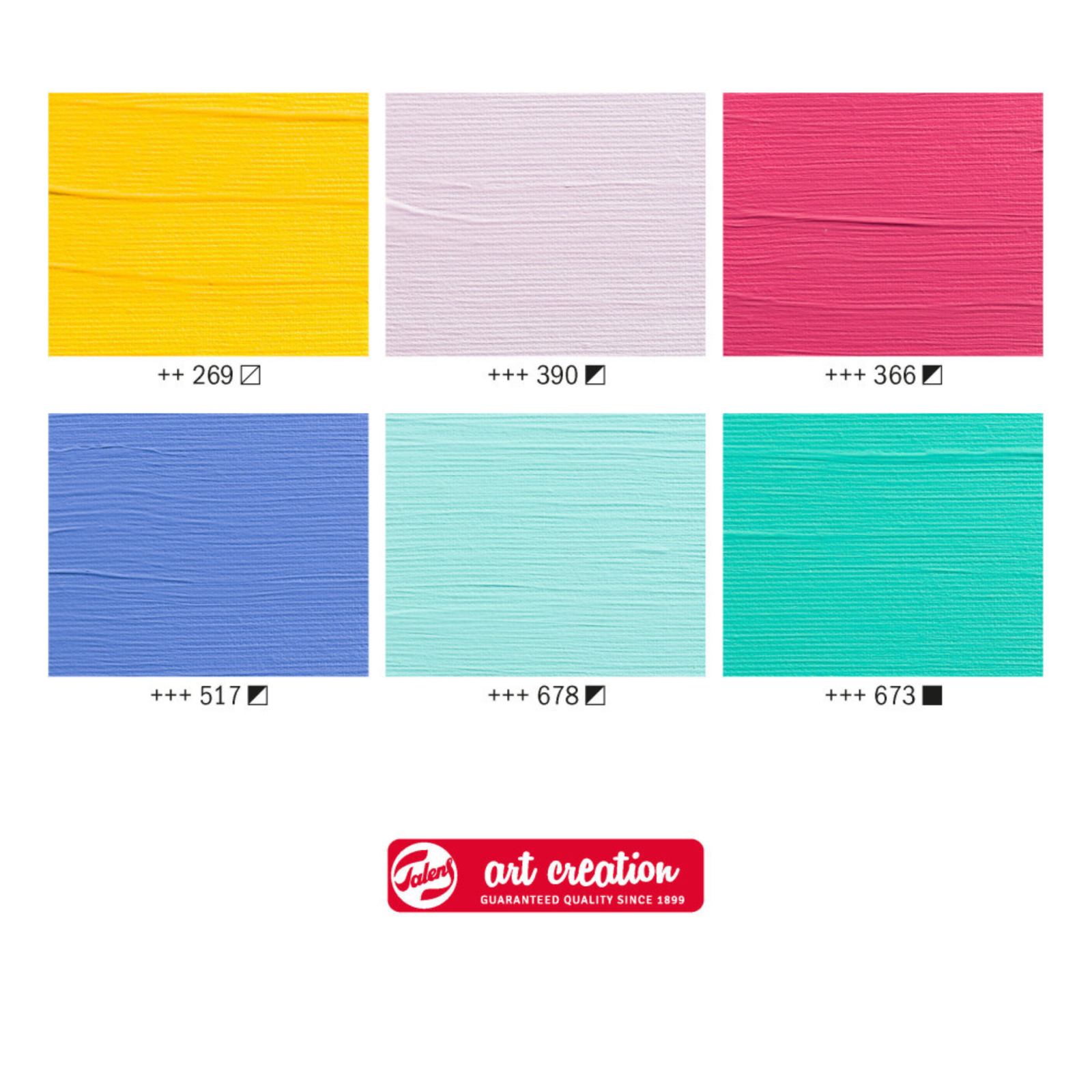 تتميز ألوان الأكريليك من Talens Art Creation بقوام كريمي كثيف يجف بسرعة ويمنح لمسة نهائية لامعة حريرية بعد الجفاف. يمكن استخدامها مباشرة من الأنبوب أو تخفيفها بالماء للحصول على تأثيرات مختلفة، كما أنها مقاومة للماء بعد الجفاف وسهلة المزج للحصول على درجات لونية جديدة.