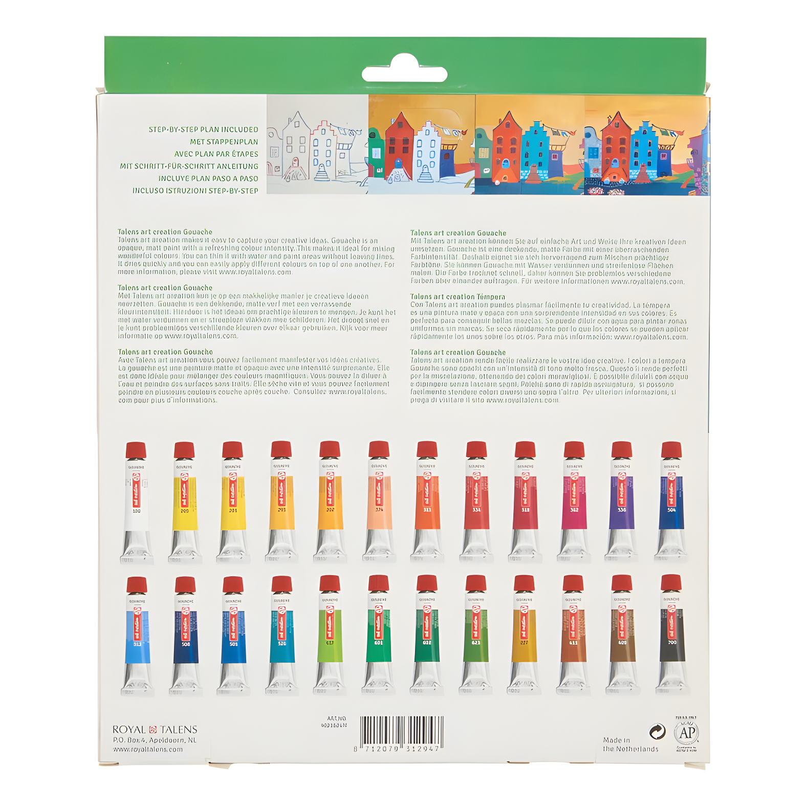 مجموعة ألوان جواش (Gouache) من Talens Art Creation تضم 24 لوناً متنوعاً تمنح الفنان مجموعة واسعة من الدرجات اللونية لإنشاء لوحات فنية مميزة دون الحاجة إلى مزج الكثير من الألوان.