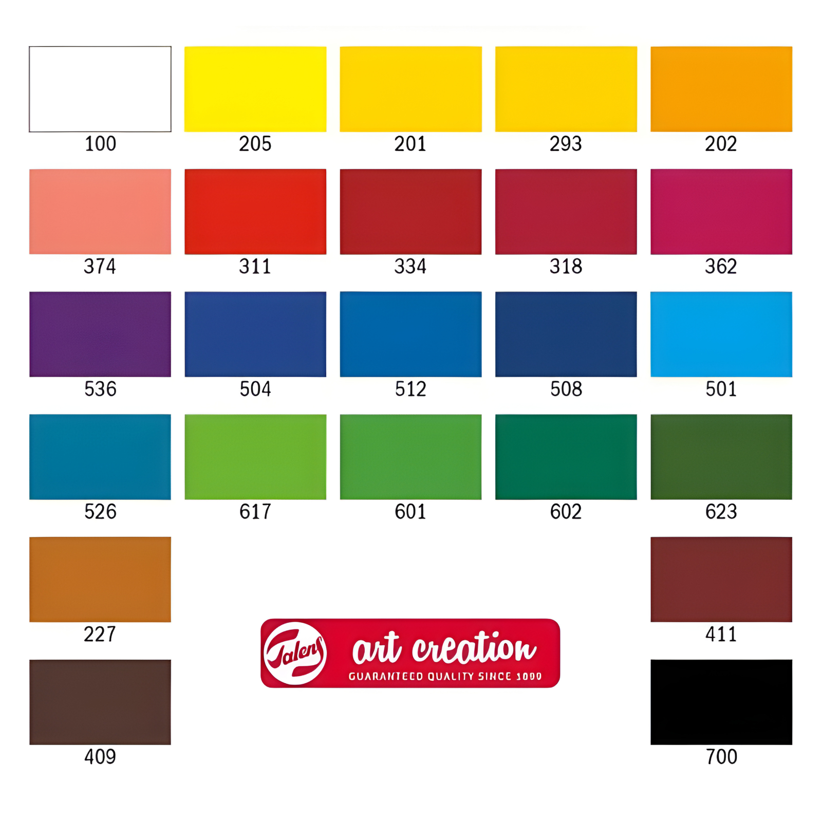 100 White – 205 Lemon Yellow (Primary) – 201 Light Yellow – 293 Medium Yellow – 202 Deep Yellow – 374 Pink Beige – 311 Vermilion – 334 Scarlet – 318 Carmine – 362 Deep Rose – 536 Violet – 504 Ultramarine – 512 Cobalt Blue (Ultramarine) – 508 Prussian Blue – 501 Light Blue (Cyan) – 526 Azure Blue – 617 Yellowish Green – 601 Light Green – 602 Deep Green – 623 Sap Green – 227 Yellow Ochre – 411 Burnt Sienna – 409 Burnt Umber – 700 Black
